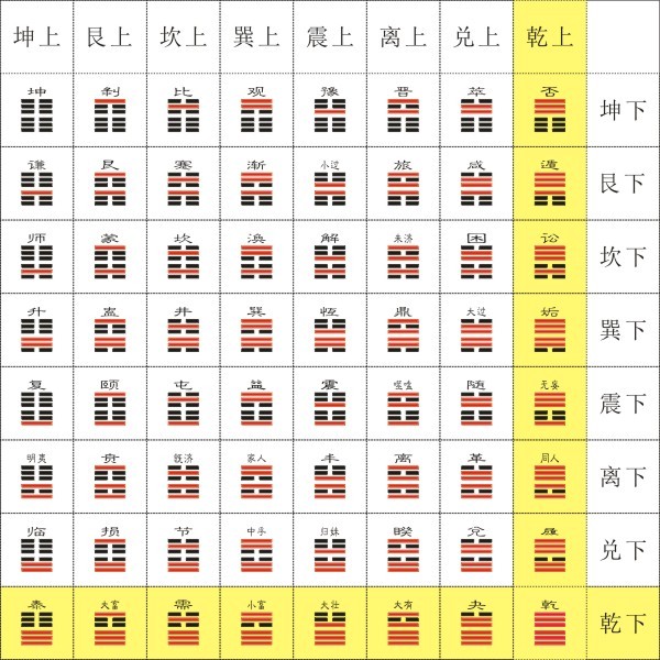 如上图,以乾卦为“心”,下卦均与乾卦的下卦相同的七个卦(乾下),上卦均与乾卦的上卦相同的七个卦(乾上)。