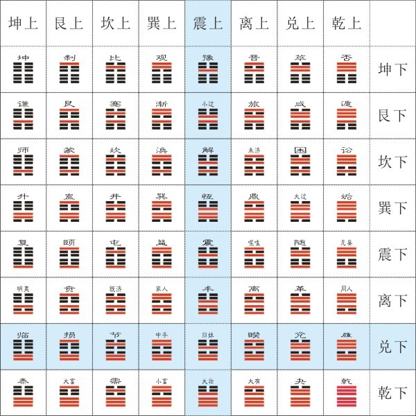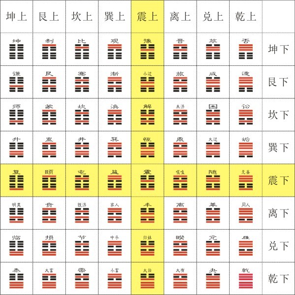 如上图,以震卦为“心”,下卦均与震卦的下卦相同的七个卦(震下),上卦均与震卦的上卦相同的七个卦(震上)。