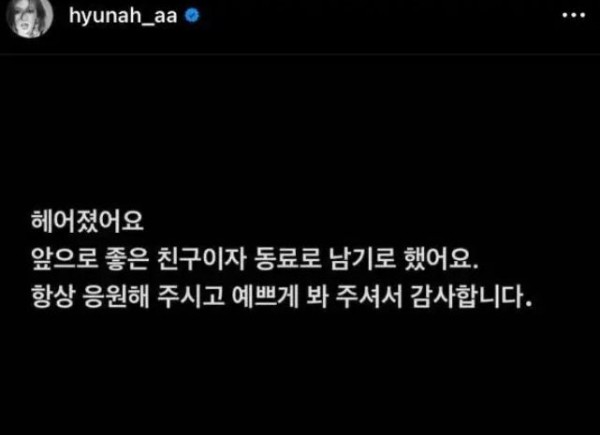 11月30日,泫雅金晓钟突然同时在社交平台上发文宣布分手。文中提到:我们分手了,以后要成为好朋友和同事,谢谢一直以来的支持和喜欢。就这么简单的一句话,结束了他们六年的恋情。