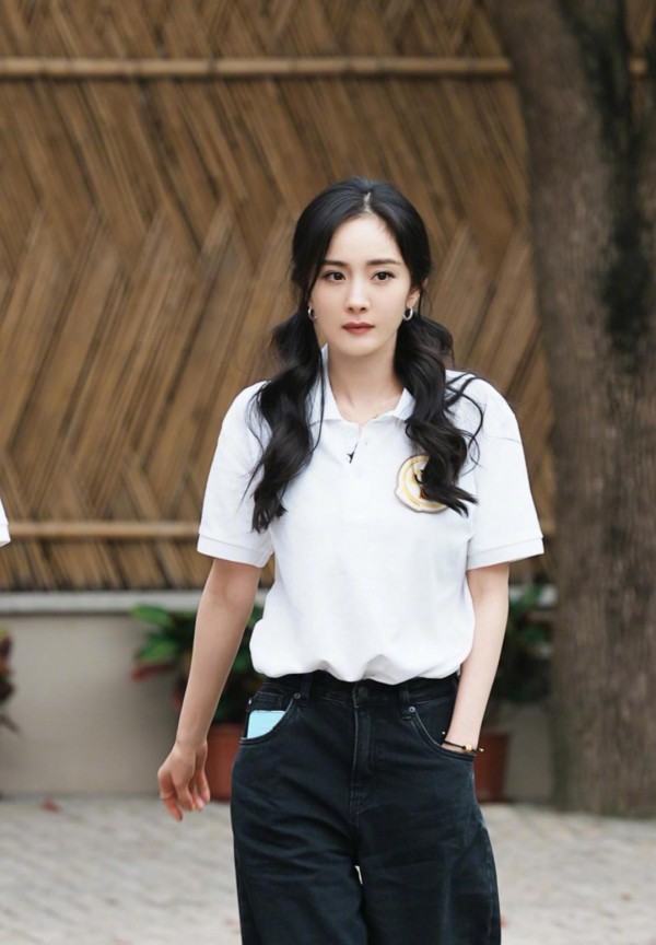 在网友晒出的照片中,演员杨幂身穿白色T恤搭配高腰牛仔裤,扎着双马尾,造型简单大方,帅气十足。