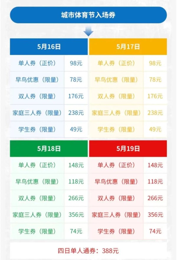 秉承着“更年轻,更城市,更开放”的赛事风范,城市体育节也将于5月16日至19日在奥运会资格系列赛·上海的赛事现场闪亮舞动。只要花费100元,上海市民就可以单独购票城市体育节,参与4天不同主题的体育节活动中,零距离接触、了解这几项城市街头运动,共同感受奥林匹克带来的魅力。