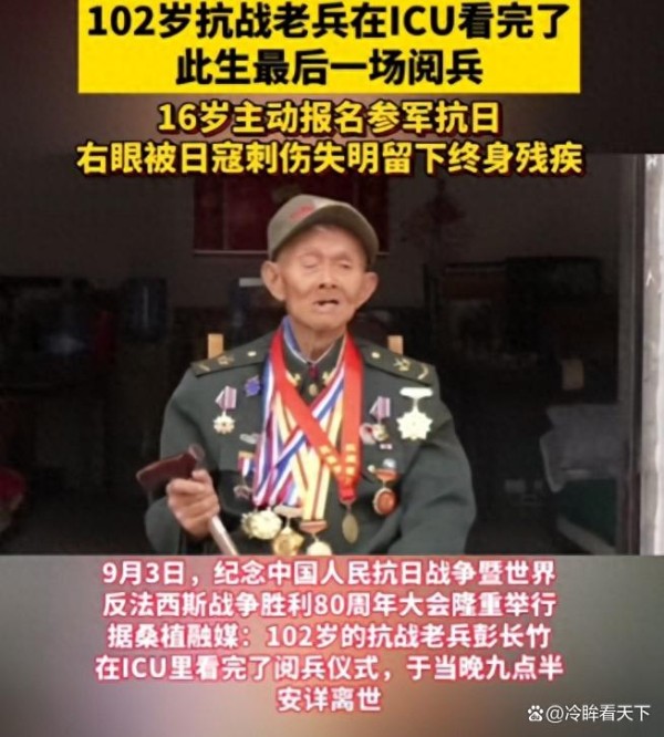 在ICU病房里,一位102岁的抗战老兵彭长竹用尽最后力气看完了“九三大阅兵”的全程。屏幕里,步伐铿锵、战车轰鸣;屏幕外,老人目光专注,布满皱纹的脸上浮现出欣慰。当晚,这位曾经在战场上重伤幸存的老兵安详离世,仿佛完成了最后的心愿。他的故事,让无数人泪目。