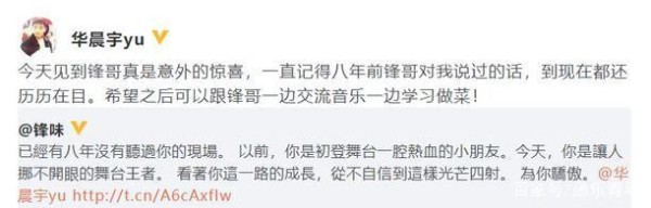 而华晨宇在看到谢霆锋的夸赞后,也回应道:“一直记得八年前锋哥对我说过的话,到现在都还历历在目。希望之后可以跟锋哥一边交流音乐一边学习做菜!”