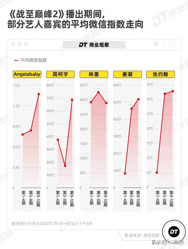 比如Angelababy、姜潮、池约翰的微信指数,都在《战至巅峰2》节目播出的前、中、后期大幅攀升。