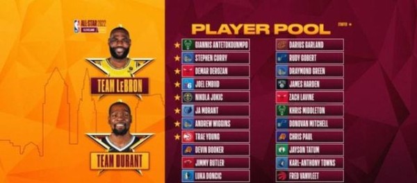 随着哈登成为最后一个被选走的人,2022年全明星队长选人落下帷幕,最终詹姆斯队首发阵容为(按选择先后)字母哥、库里、德罗赞、约基奇;替补球员由东契奇、加兰、保罗、巴特勒、米切尔、范弗利特、哈登组成。