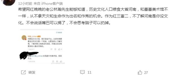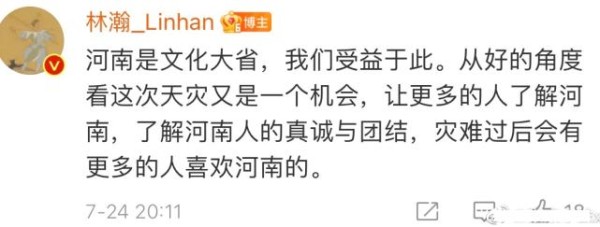七月二十四日晚,网红晚上的丈夫林瀚在社交平台上发文:河南是文化大省,我们受益于此,从好的角度来看,这次天灾是一次让更多人了解河南的机会。林瀚发完这条微博后,迅速引起了不少网友的热议,从字面上看,他似乎在帮河南说话,仔细一看,发现有些不对劲。