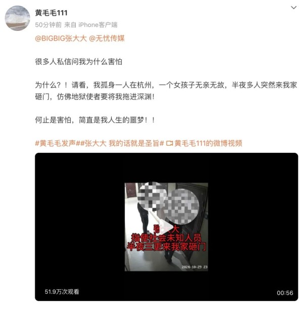今年1月25日,该网友又在相关爆料博文中称,张大大“派社会未知人员三更半夜上门砸门”。