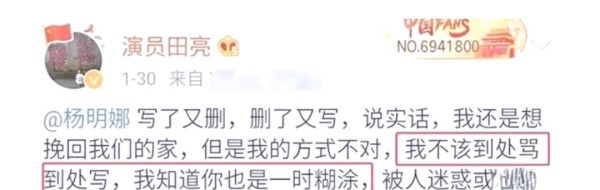 说实话,每月15000元的生活费已经相当可观,远高于国家的平均水平。然而,在离婚后的短时间内,田亮似乎并不满足于现状。他以资金不足为由,多次向杨明娜提出提前支付抚养费的要求,甚至试图向她借款。在遭到杨明娜的拒绝后,田亮可能因愤怒而与她产生了纠纷。此外,田亮在网络上公开发表了诸多针对杨明娜的言论,包括声称孩子在医院时她却与他人共处宾馆,以及指责她只顾自己享乐而不顾孩子等。然而,在杨明娜以损害个人名誉为由发出律师函后,这些言论均被删除。值得注意的是,田亮在今年年初就曾多次发表此类言论,甚至曾在自己的微博上向杨明娜道歉。此前,面对田亮在网络上的不当言论,杨明娜为了给孩子一个稳定的成长环境,选择了一再隐忍。然而,这次她决定不再沉默,而是公开向网友们阐明了事情的来龙去脉,为自己的名誉和孩子的未来进行辩护。