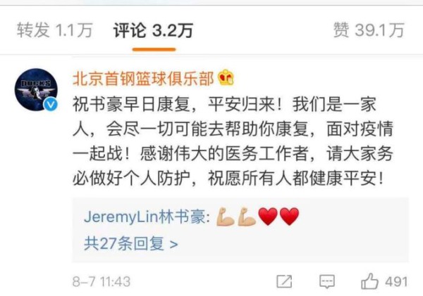 北京首钢篮球俱乐部在林书豪微博下评论,祝早日康复,平安归来!