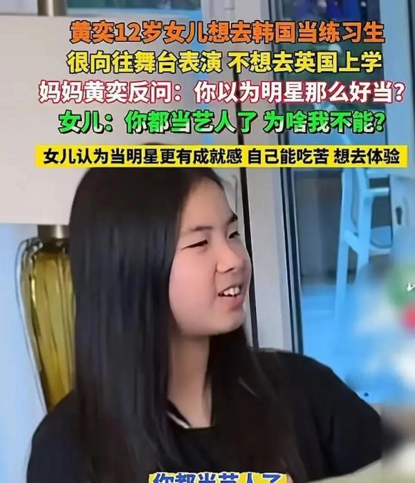咱们就这个争议谈起吧,一切都得从黄奕发的一条视频说起。视频里她提到女儿想去韩国当练习生,而自己却不太支持。她的理由说得挺实在:一方面,自己对娱乐圈的残酷有切身体会;另一方面,又坦白说,女儿长得像前夫,貌似没有啥偶像的外表优势。