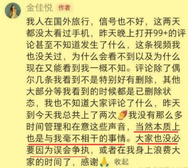 金佳悦为了消除大家的误会,不得不在深夜紧急进行辟谣。她说,自己目前正在境外旅游,信号不是特别好,没怎么看手机。但是打开手机后却突然冒出来非常多的评论,当时让她一头雾水,不知道到底发生了什么事。