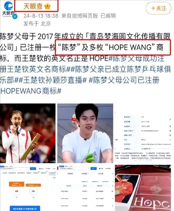 当时好多“证据”都出来了,什么他俩穿过差不多的帽子、衣服,还有一些背包配饰,就被解读成是“情侣款”,好像都在偷偷秀恩爱。甚至连陈梦妈妈注册的一个商标,都被拿出来说跟王楚钦的英文名一样,这脑洞开得有点大。