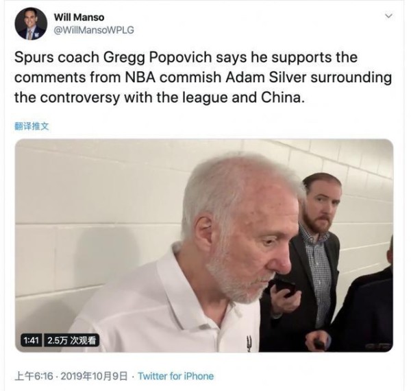 今天早上,NBA名教波波维奇也发表了自己对此事的看法,在采访中他这样说道:“这就是自由发表言论——这种感觉真的很棒。作为联盟的领导者,我对肖华很尊敬。这件事对于肖华他来说,并不容易。在一个充满可能的经济较为危险的环境中,他站在了我们所有人都珍视的原则这一边,或者说在过去三年里我们大多数人都是秉承这一原则的。所以他声明中说的那些话让我感到很激动。”