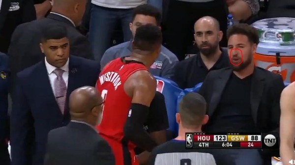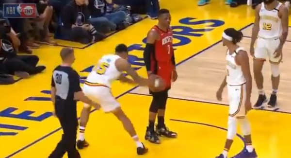 在末节还剩不到半节时间,威少在一个回合中抢到前场篮板,他和勇士球员有身体上的接触,而安德森甚至去威少手中直接抢球,这让威少非常不满,双方发生言语上的冲突。值得一提的是,威少还和勇士替补席的克莱产生口头之争,威少弯腰在场上和勇士替补席球员喷垃圾话,而克莱也进行回应,而且面带笑容,不知道克莱到底说了什么,威少之后被彻底激怒,随后裁判吹罚威少技术犯规。