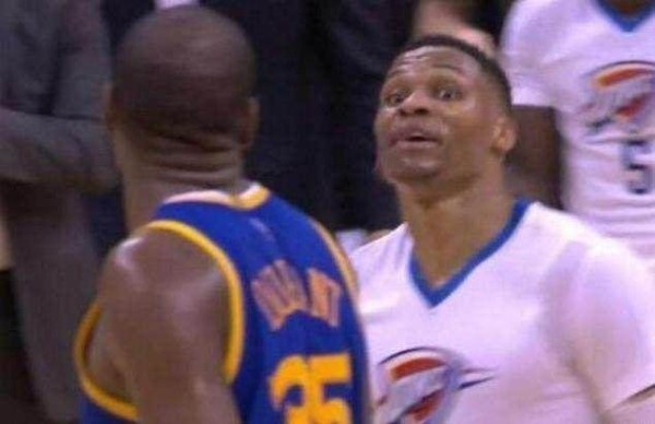 自此,杜兰特伤透了威少的心,两人的关系,就此降到冰点。当球场上再次相见之时,威少瞪起大眼,朝着杜兰特怒吼:我冲着你来的,而杜兰特不甘示弱回击道:反正你还会输。