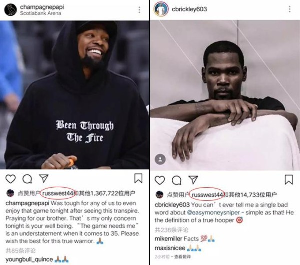这些社会名流和球队工作人员发动态为杜兰特祈福本来没有什么奇怪,但是让人觉得比较诧异的是下面的点赞用户。Drake和Chris Brickley的动态下都有一个名字叫“russwest44”的用户点赞,也许很多球迷不知道这位用户是谁,但是我们可以从用户猜到一二。这个“russwest44”不是其他人,而是俄克拉荷马雷霆队的当家球星拉塞尔-威斯布鲁克。所以很多人看到这个点赞后都觉得诧异,因为在他们的眼里,自从杜兰特离开雷霆后,威少和杜兰特就势同水火了,并且还有很多人误会威少。