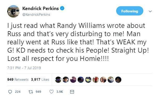 帕金斯在推特上回击道:"刚刚看到了Randy Willams写的有关于威少的事情,这真的很让我生气。他居然真的那样抨击威少,这真的弱爆了!杜兰特得管好他的人,对你失去了所有的尊重。"值得一提的是,这已经不是帕金斯第一次为威少打抱不平了!