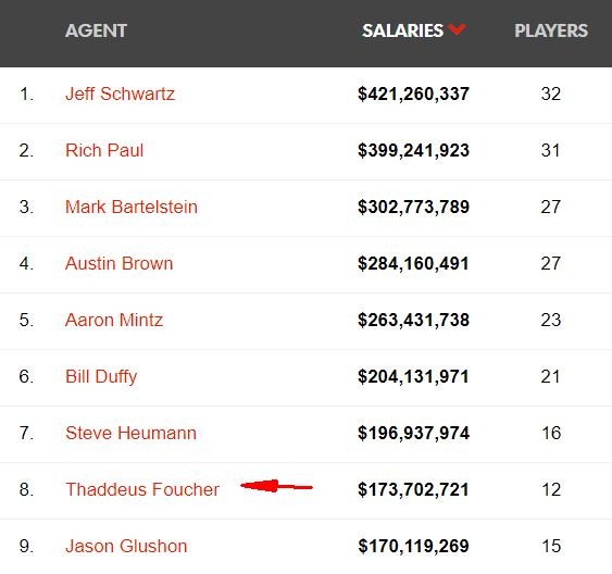 首先,萨德-福切尔在NBA圈内还是颇有名气。在威少和他分手前,福切尔在NBA经纪人的年度排名中位居第八,这份年度排名的标准是经纪人签约球员的总年薪。算上威少,福切尔一共签有12位NBA球员,2022-23赛季的总年薪是1.737亿美元。