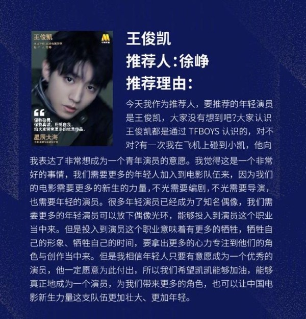 在金鸡奖的开幕仪式上,诸多知名导演推出"星辰大海"的演员计划,旨在力捧一些优秀的青年演员。其中徐峥作为喜剧导演,眼光是毋庸置疑的。他推荐的人选则是新生代偶像王俊凯,作为演员王俊凯的作品虽然不多,但是潜力却一直被看好。这也可以看出徐峥对王俊凯的认可,两人的关系也不错。近日在接受采访的时候,徐峥还自曝女儿也是王俊凯的粉丝。又一次在飞机上偶遇王俊凯,还为女儿助攻在线索要王俊凯的演唱会门票。