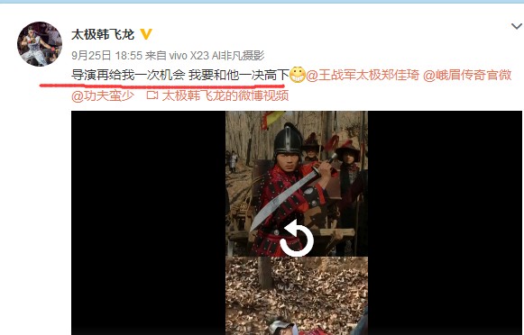 近日,韩飞龙在其个人社交媒体发布了一条其参演的影片的一个小片段,镜头中的韩飞龙身穿头盔铠甲,扮演一名小头目,在与对手对打的过程中,动作也是相当的潇洒飘逸,反而与其演对手戏的高手武打动作生涩,僵硬。随后镜头一转,韩飞龙饰演的角色竟然口吐鲜血,遗憾倒地而亡。