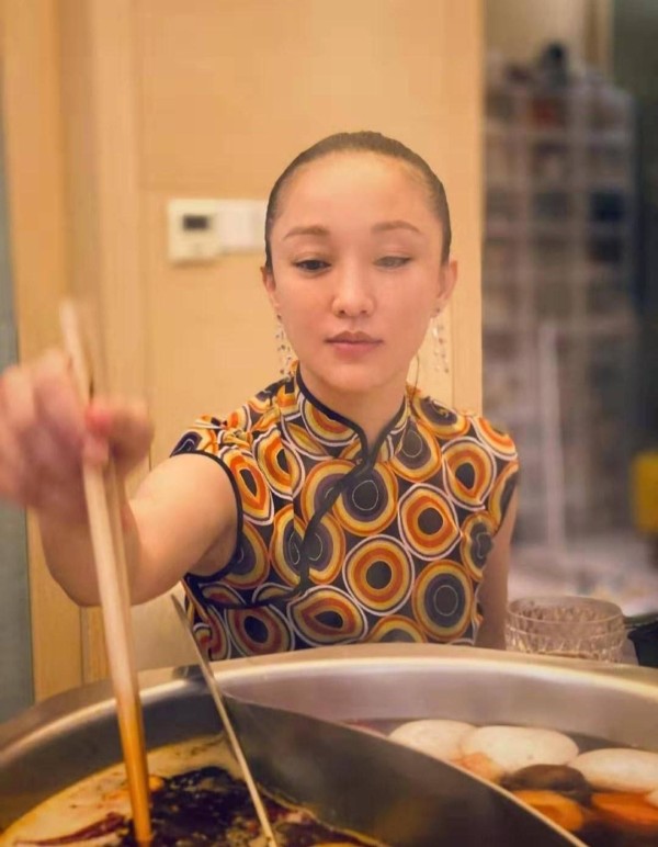 周迅可就不同了,可以说是盛装出席“火锅之约”。一身修身的旗袍加上高高梳起的发髻,高冷有端庄,旗袍上的橙黄色印花图案却又十分热情,与火锅的热闹气氛都非常契合。不过如此正式的周迅好像并不是为好友而穿,眼里手中都是火锅,倒真像是为火锅而打扮。