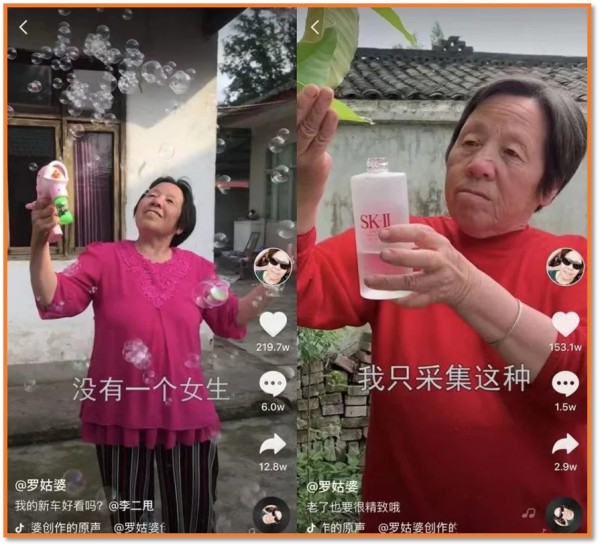 比如当时较火、年过六旬的村妇罗姑婆,在椒盐视频的包装下,化身为年轻人情感专家,不管是在视频里打麻将、唱RAP、还是输出情感经验,她的动作设计、都以年轻人的喜好为潜在目标。