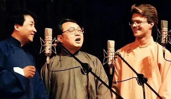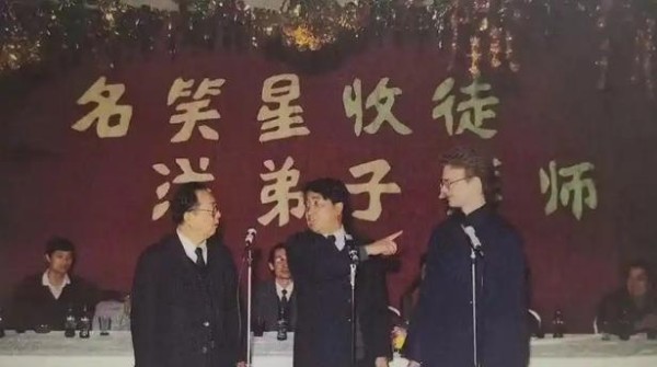 1989年,一位加拿大青年在北大与姜昆举行了收徒仪式。幕布上写着“名笑星收徒,洋弟子拜师”。