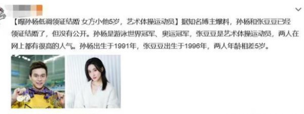 奥运冠军孙杨被曝结婚,女方是体操运动员张豆豆,两人疑似已领证