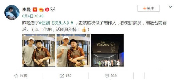 8月4日,李晨在社交平台上发文为史航的话剧做宣传,看来也去捧场了自己朋友的作品。