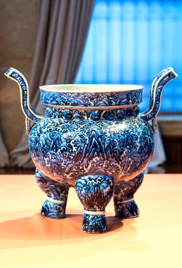 在《国家宝藏》节目的第一季开始时,其Logo上的“藏”字便给人留下了深刻印象。这个字中所蕴含的器物,正是节目要介绍的珍贵文物——来自故宫博物院的明永乐青花海水江崖纹三足炉。这件国宝以其独特的历史背景和精美的纹样,成为了节目中的一大亮点。