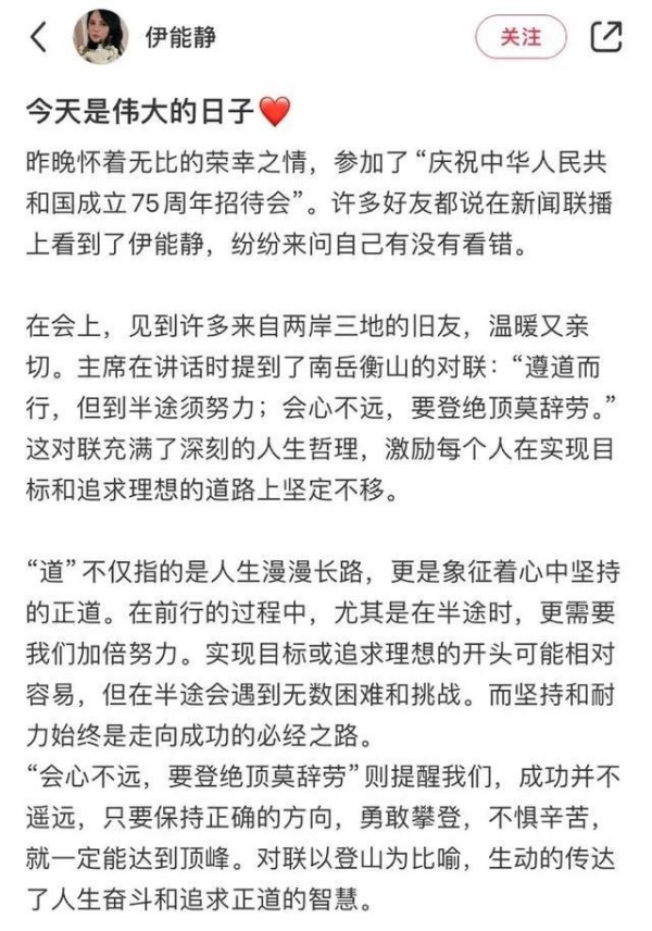 这一连串的消息让我瞬间清醒。赶紧打开新闻联播重播,果然在庆祝中华人民共和国成立75周年招待会的画面中,看到了伊能静那熟悉的身影。啧啧,这可真是个大新闻啊!
