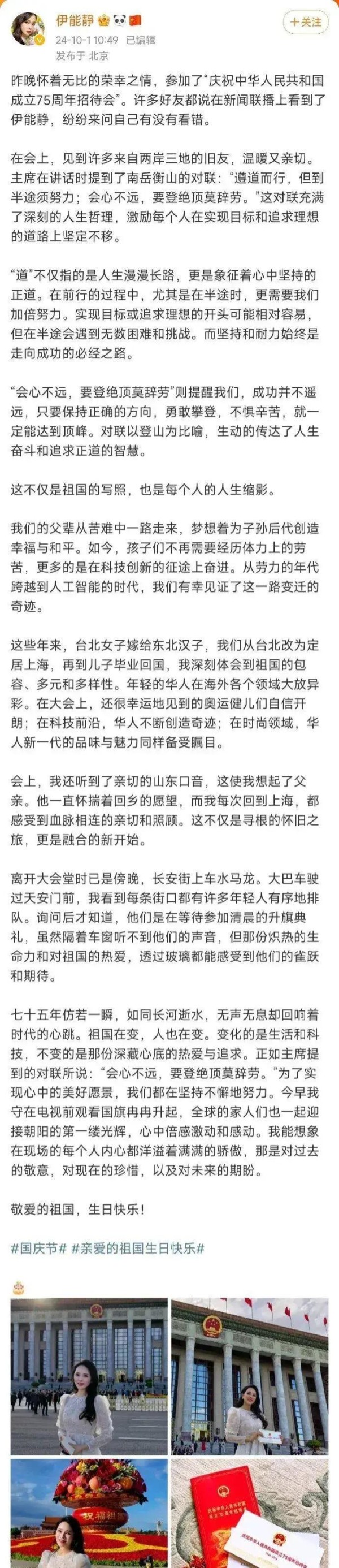 伊能静国庆招待会惊艳亮相,人民大会堂前留影伊能静国庆招待会惊艳亮相,凭才华与爱国情怀赢得网友赞誉!