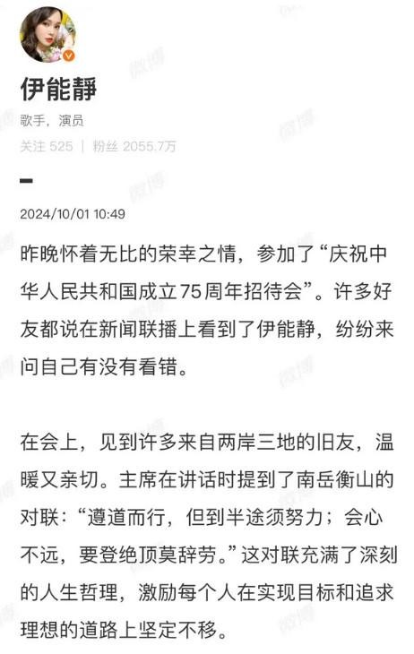 受邀参加国庆招待会,伊能静发长文祝福祖国生日快乐