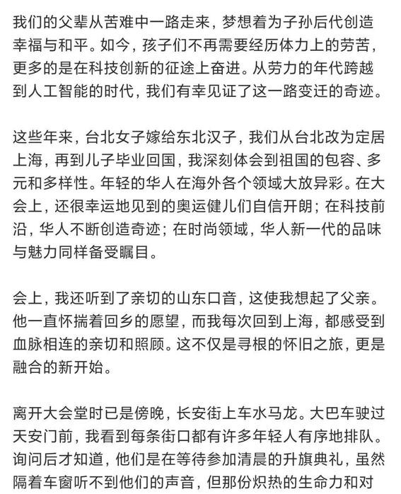 不仅仅是这次露面本身,伊能静的长文里还充满了对于家国情怀的深刻体会。她回顾了自己父辈的艰辛历史,以及从台北到上海的生活变化,甚至提到了她父亲怀揣着回归故乡的愿望。这种家国情怀,对于经历过两岸历史的人来说,尤其深刻。伊能静在这篇文章中表达了对祖国日益强大的感慨,并指出,这不仅是她个人的荣耀,更是对所有中华儿女的一种共鸣。