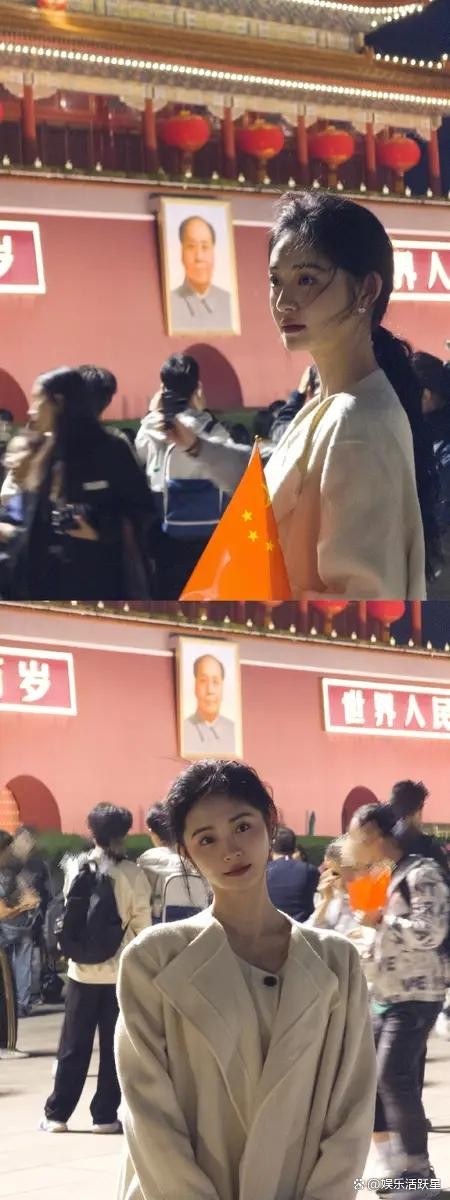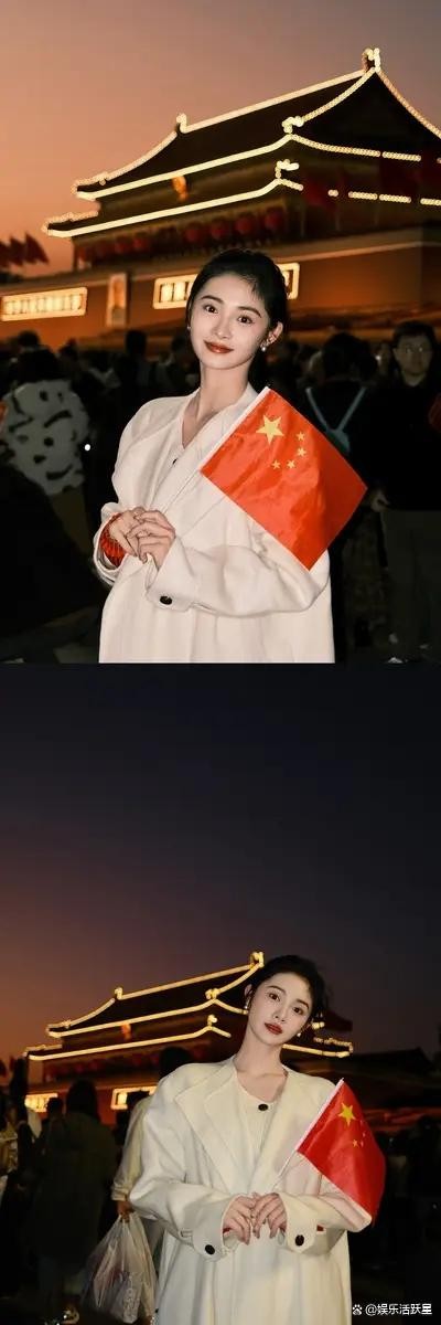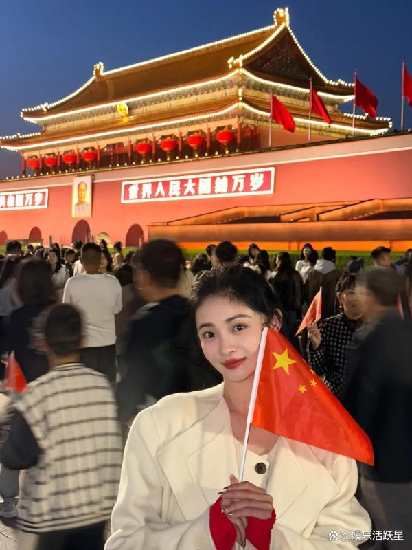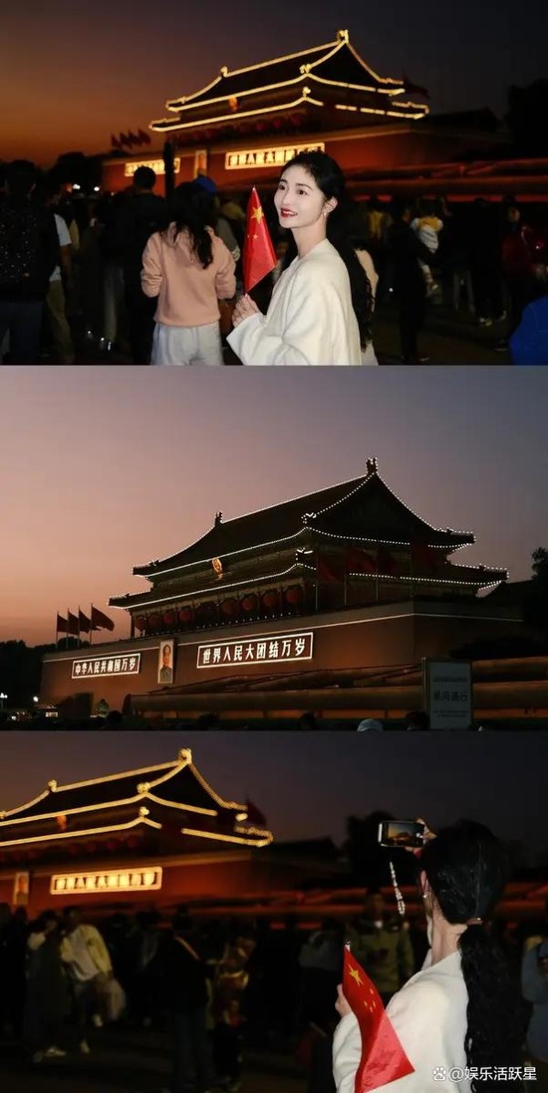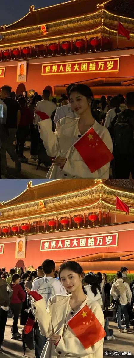 演员周洁琼国庆北京天安门打卡,手举国旗自拍从容自信!卢昱晓国庆节亮相北京,打卡天安门升旗仪式,幸福感十足
