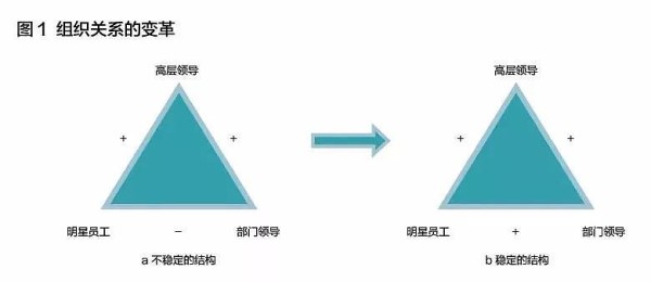 首先,要建立高层干预制度。正因为双方的价值追求不同,根据美国社会心理学家弗里茨·海德尔(Fritz Heider)的权力平衡理论,此时便应有更具影响力的第三方介入,有助于稳定二者关系。如图1a所示,部门领导与明星员工都是备受高层领导器重的左膀右臂,若二者不合,相互拆台,那么三者关系一定不平衡。高层领导适当介入,从三个方面进行干预,有助于形成三角形那样的稳固结构(如图1b所示)。