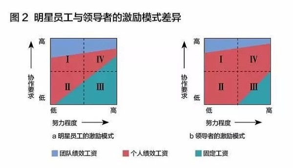 如图2a所示,当明星员工很努力而组织需要他们发挥个人创造力时,应采用以固定工资为主的薪酬模式(如协议工资制),减少绩效工资对他们内在创新动机的束缚(见图2a象限);若组织需要他们引领团队发展时,宜采用个人绩效工资为主体的薪酬模式,鼓励他们发挥示范作用,同时辅以团队绩效工资制,让他们承担更多的团队辅导职责(见图2a象限)。正如一项研究揭示的那样,为提升团队绩效,明星员工会主动把自己的忠实客户让给普通员工,自己再去发掘新的客户源。当然,若明星员工不努力,则采用绩效工资制度倒逼之(见图2a象限)。合作要求高时,宜采用团队与个人绩效工资混合制(见图2a象限)。