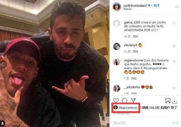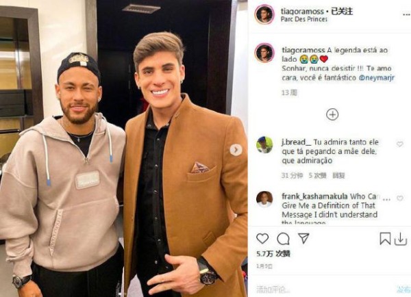 《环球网》文章写道,蒂亚戈一直设法接近内马尔的好友圈,他经常去巴黎看内马尔比赛,也会参加内马尔出席的明星生日宴。很显然,蒂亚戈和内马尔关系也不错。显然,这些流言没有影响蒂亚戈的心情,也没有影响蒂亚戈和内马尔的官宣。蒂亚戈晒出和内马尔合照后发文表示:“身旁就是传奇!梦想,永不放弃!我爱你Man,你太棒了!”