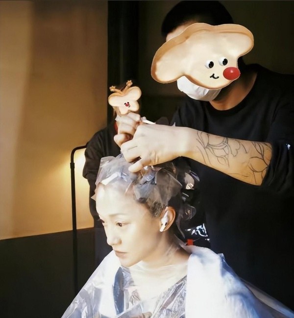也有时候围着眼罩坐在椅子上染头发,冲镜头比个耶,像个普通人打卡,轻松得叫你忘记她是影后