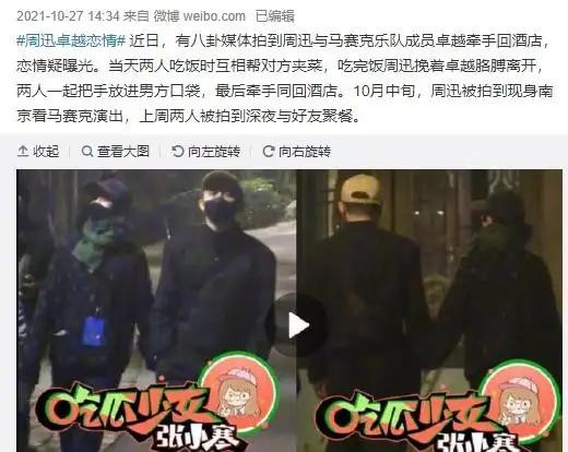 周迅此前被媒体拍到与马赛克乐队成员卓越牵手,然后回酒店,有这样的画面出现,到现在周迅本人都没回应,不过牵手动作已然是实锤了 。