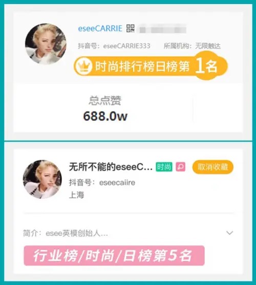 eseeCARRIE,1997年进入模特行业,2000年在上海创立esee英模,成为esee英模的创始人兼首席经纪人,2002年注册esee全品牌,成为中国最大的模特经纪管理公司。杭州无限触达团队自18年11月份携手英模文化共同打造@eseecarrie个人ip,进行全平台时尚类头部帐号自媒体内容创作、截至2022年10月下旬,全网粉丝数统计三千多万+