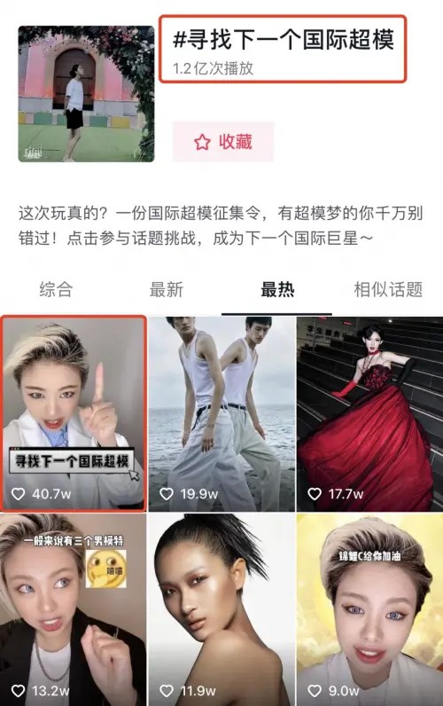 单日点击量破百万,原创爆款话题&自创挑战赛#寻找下一个国际超模24h内热点榜top2,互动效果全站第一,72h点击量过亿。