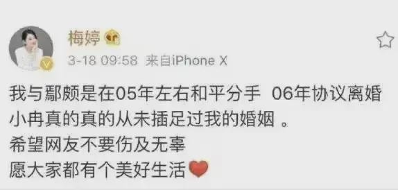 眼看着舆论越演越烈,梅婷出面阻止了事态的进一步扩大,梅婷承认了自己与鄢颇的离婚事实,并澄清李小冉并没有插足他们的婚姻。