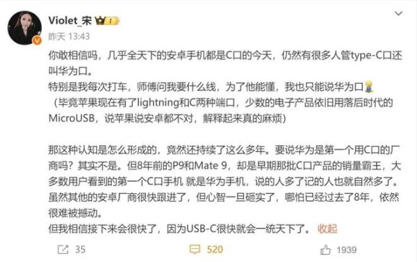 “你敢相信吗,几乎全天下的安卓手机都是C口的今天,仍然有很多人管type-C口还叫华为口。