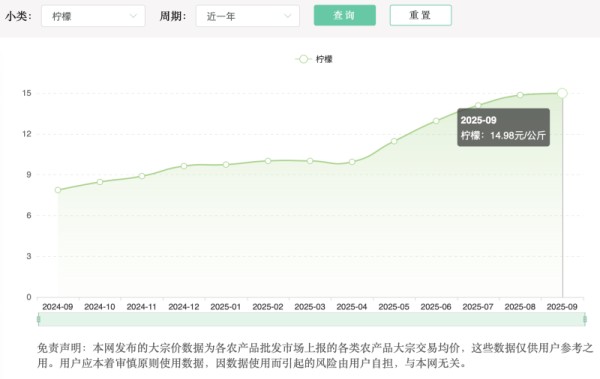 据全国农产品(8.340, -0.06, -0.71%)批发市场价格信息系统显示,截至9月22日,柠檬的全国批发均价在14.98元/公斤,比去年同期的7.87元/公斤上涨了将近一倍。