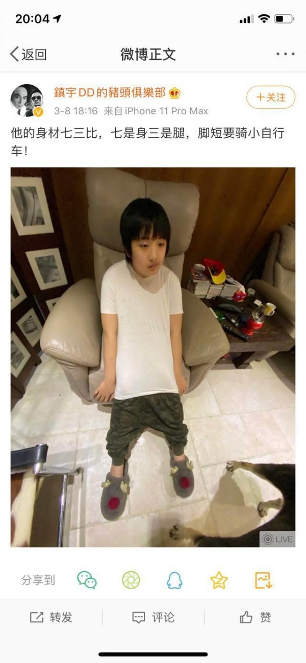 3月8号晚间时刻,香港演员吴镇宇在社交平台晒出一张儿子费曼的最新居家照,配文笑称儿子七三比。