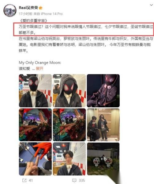 最近费曼在社交平台晒了张和杨阳洋的合影,还配了一句:“万圣节找谁玩。”