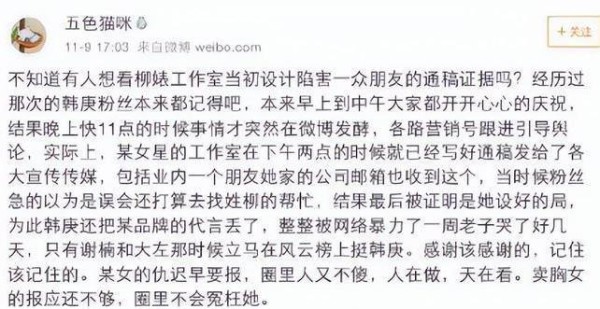 有人爆料称,整件事其实是柳岩暗中操纵,还买通稿陷害一众朋友,弄得韩庚的代言没了,包贝尔还一直被骂。