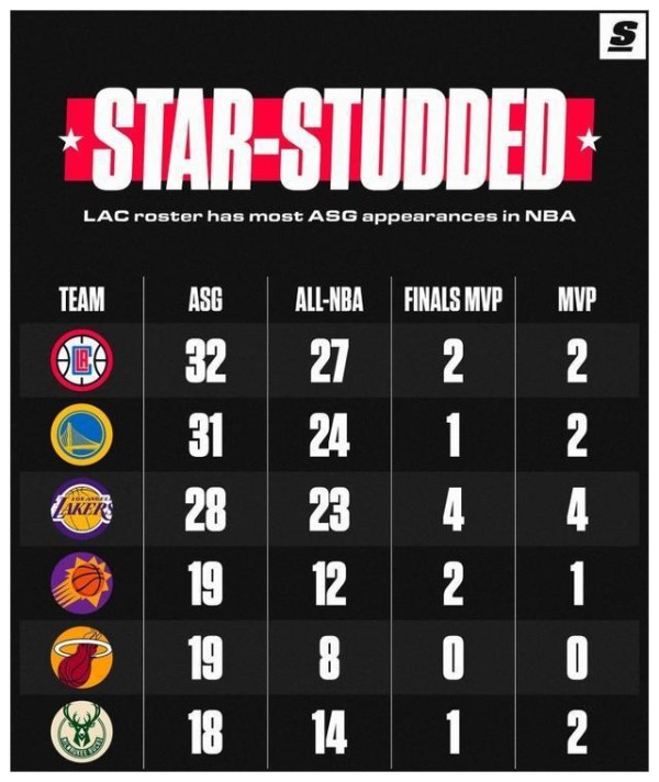 比勇士还多一次!快船全队总计32次全明星,勇士31次,湖人28次快船独步全明星!32次超越勇士,湖人也遥遥落后