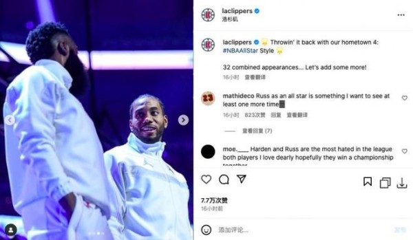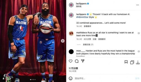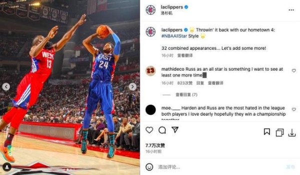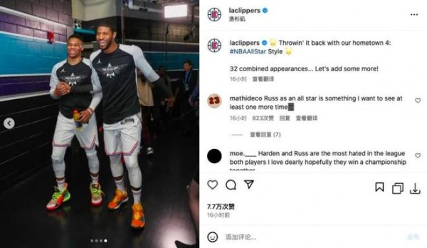 今日快船官方晒出了球队四巨头威少、哈登、小卡、乔治的昔日全明星赛场照。